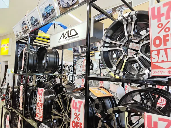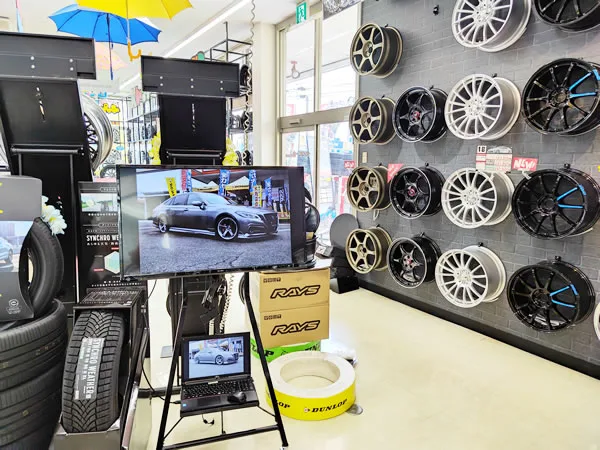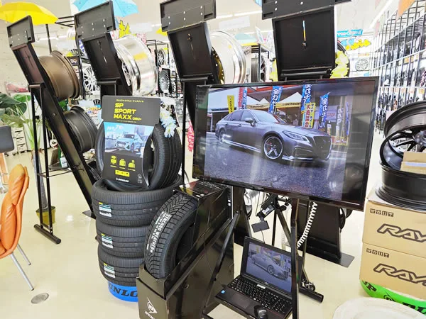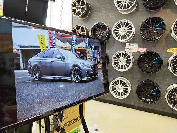 店内モニターでは、豊富な取付実績をご覧いただけます。お客様の愛車とご希望のホイールがどうマッチするのか、リアルなイメージでご確認ください。ホイール選びの参考に、ぜひお気軽にご利用ください。